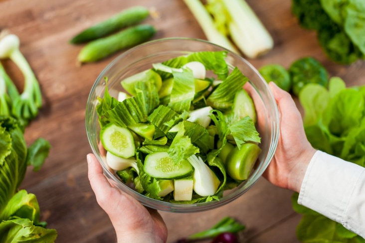 Для овощного варианта можно употреблять огурцы, помидоры, капусту, кабачки и листовую зелень в разных сочетаниях, добавляя немного лимонного сока или чайную ложку оливкового масла.